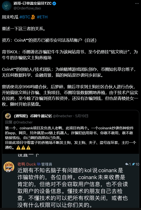 内容来源:老鸭 Duck@laoyaduck。编者注:老鸭 Duck标签为 @rushduckarmy 创始人, @coinank_com|投资者,@ducksniper_bot创始人。 简单总结:事主5.24发文称币安账户被冻结,之后有人提醒是否受项目牵连,后币安客服介入,最后查明是涉嫌与泰国涉黑账户转账导致。