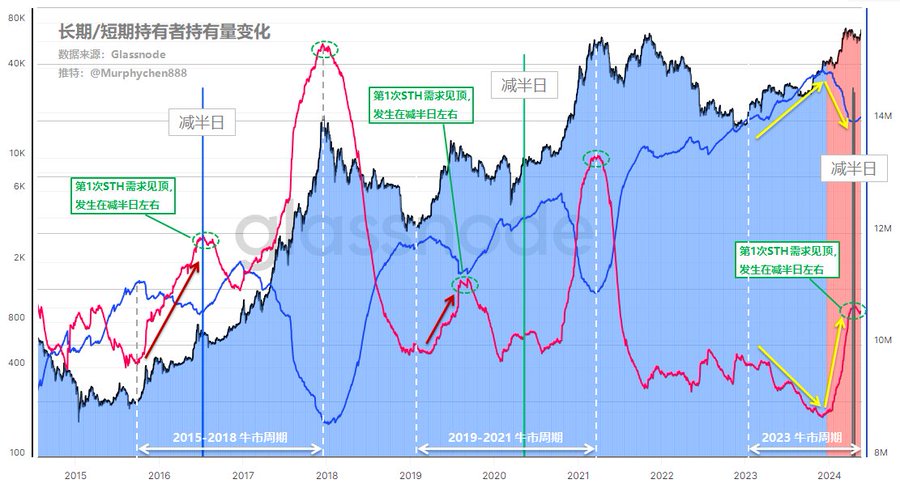 和上一轮周期一样,当STH需求开始上升时(见图中红色箭头)也同样是市场从熊市最底部开始进入牛市启动之时。第1次STH需求见顶,发生在减半日之前。第2次STH需求见顶,同样也是本轮周期的顶部区。