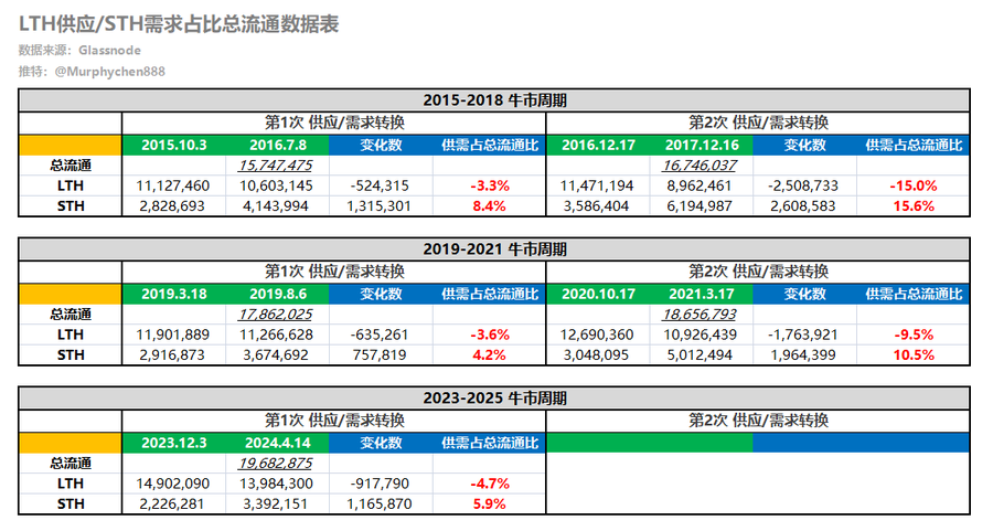 我们都知道在每一轮 #BTC 的牛市周期中,长期持有者(LTH)都会将筹码派发给短期持有者(STH),因此LTH扮演的是供应端的角色,而STH就是需求端。