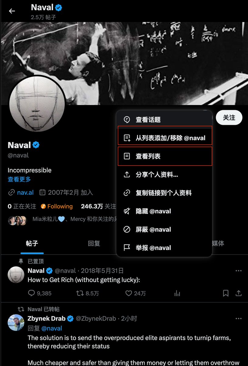 我们拿顶流账户 @Naval 举例,他自身的follwing 为0,但是list很丰富。
