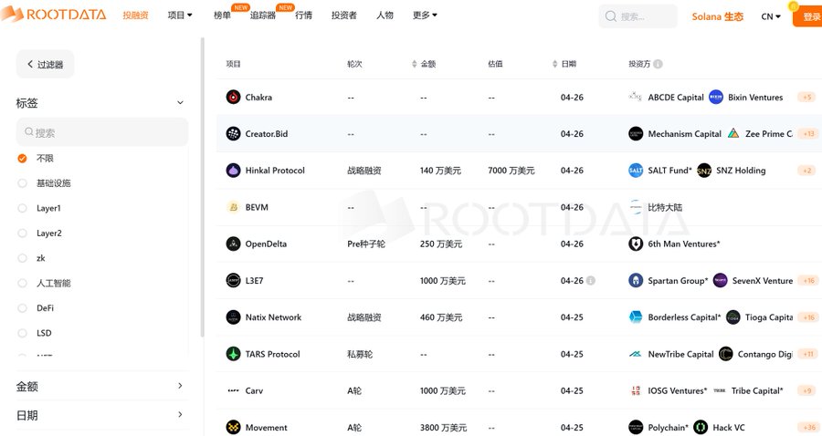 Rootdata 功能很多,可以看热门项目(trending)、看融资、按生态板块去看