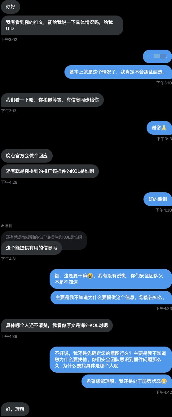 于是我找到推广KOL,我要确定他是否是黑客的同谋,如果不是,那他要立刻通知他的所有用户,马上停用这个插件,避免更大的损失,但在和他去的联系后,更加让我震惊的故事来了。