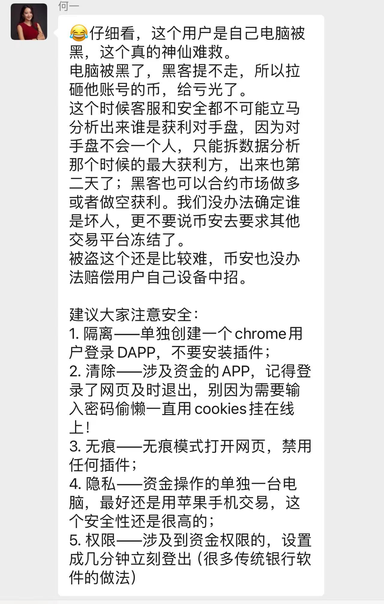 我非常尊重一姐和CZ,而且事实上,一姐也在第一时间回复了我,对我提供了帮助,在这个层面我应该感谢一姐,这件事本来应该是一个币安帮助用户挽回黑客盗币损失的佳话,而我今天在写的,也应该是一封对币安工作人员的感谢信,但现实是,币安的工作人员完完全全辜负了我的期待。