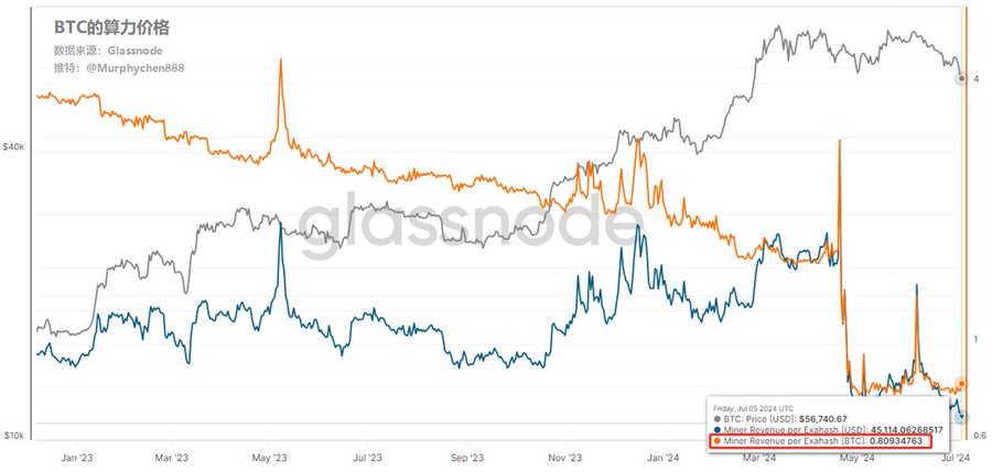 算力价格是指每天每E算力(1E = 100w T)所能产生的BTC的数量(包括出块奖励和手续费收入),当前是0.809;