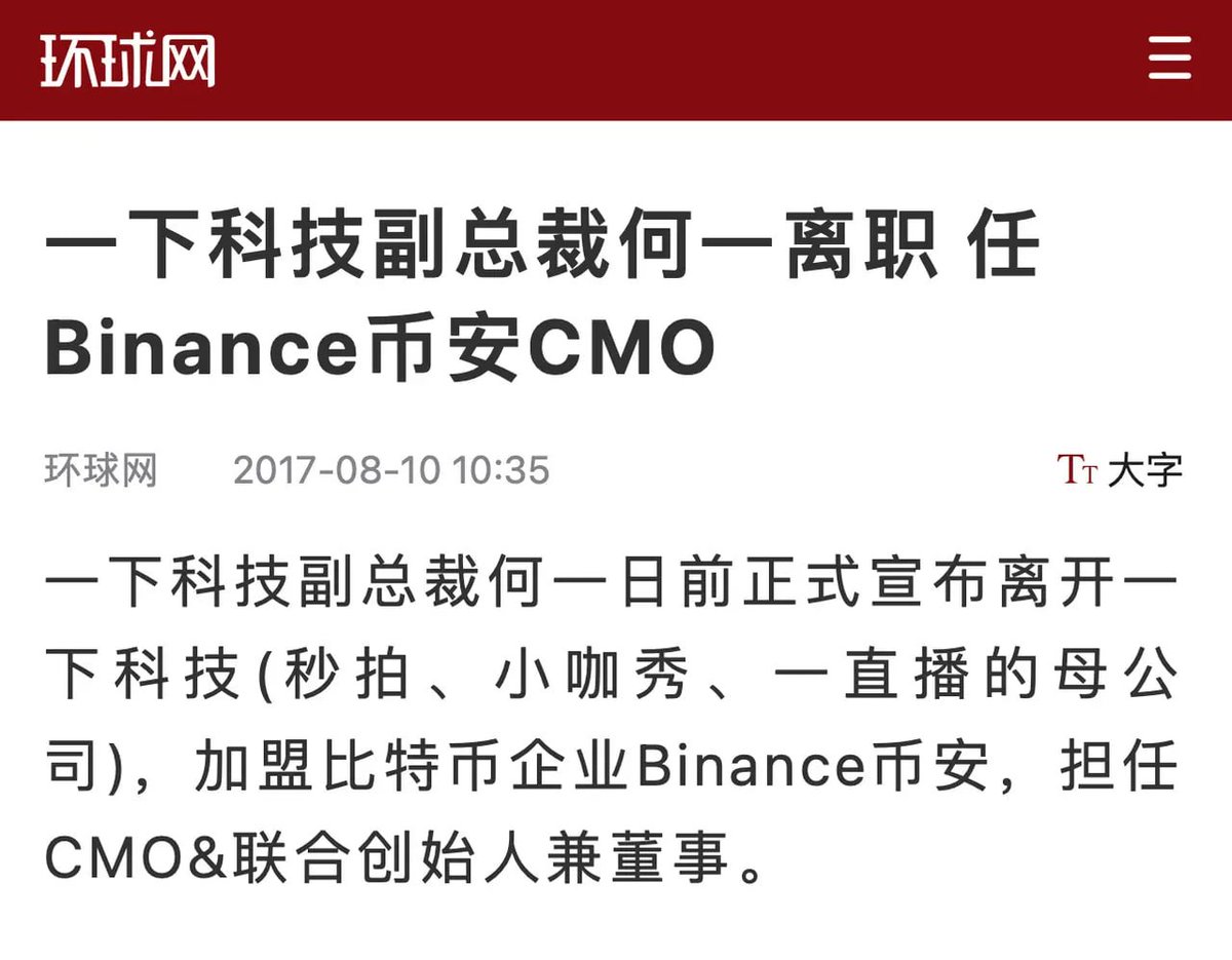 何一加入币安的消息刚开始还是保密的。但公布之后,立即引起轰动。