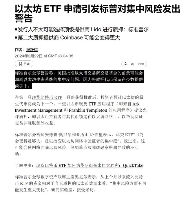 继续这个话题的时候,看到了彭博社的一篇新闻,主要讲的是标准普尔全球警告称,美国批准 #Ethereum 现货ETF 可能会加剧 #ETH 生态系统的集中度问题,因为将质押代币保留在少数提供商手中。