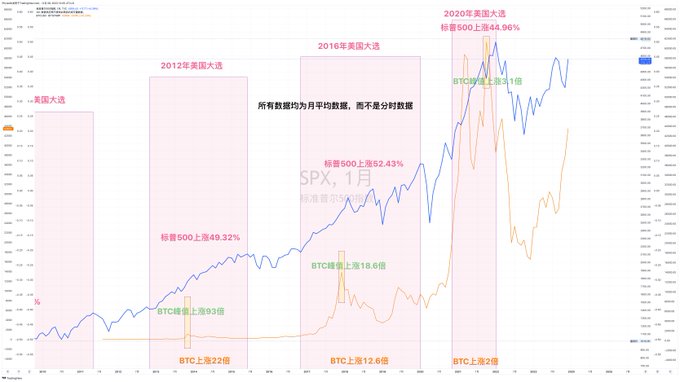 那么BTC现货ETF通过后虽然也可以吸引很多的资金,但能不能达到黄金当时的水平,现在还说不好,也因此我们可以推断出BTC现货ETF之后出现回调的概率也不小,但回调的时间却需要多方面考虑,一方面是减半周期的效应。众所周知在BTC的减半历史中,并不是从减半发生的那一刻就开始大幅上涨,一般都在半年后。有趣的是BTC的减半周期正好对应的都是美国总统选举,也就是我们常说的美国大选,而且BTC大幅上涨的周期都是在美国大选对风险市场影响最大的时候,可以明显看到这个时期的BTC和标普500有较强的重合度。大选带动资金,而资金成就BTC。