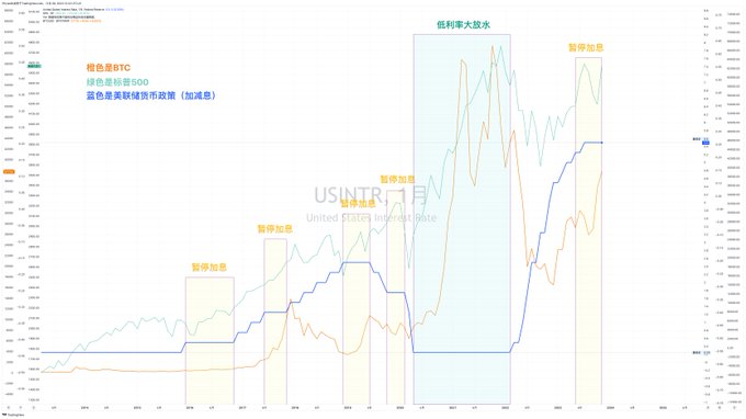 先说暂停加息,我们在最后一跌的专题中用数据分析了,从1992年开始的暂停加息过程中,发生过六次很明显的暂停加息(实际次数更多),其中只有一次在暂停加息时标普500是下跌的,其他的全部都是上涨的,所以暂停加息多数情况下都是有益于风险市场的,而这并不仅仅是在传统风险市场,即便是 #BTC 也是受到暂停加息的影响,甚至是和标普500保持高度一致,都是在2000年的暂停加息出现了下跌,其他全部都是上涨。