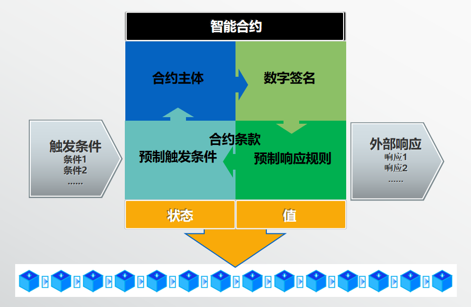 本聪老师:智能合约包括合约主体(签约方),数字签名,合约条款。合约条款中规定了合约触发的条件和响应规则。当满足条款的条件发生时,会触发合约自动开始自执行,执行结果或许会导致他外部响应,并输出合约状态的变化和响应值到区块链上。举个例子,假设合约条款是这样:输入#1是数字,输入#2是求和符号(+号),输入#3也是数字,输入#4是计算结果(=号)。比如我们为该合约分别输入2、+、3、=,那么合约输出会是值5以及合约状态变化值(合约被某主体执行了1次)。这个结果会成为一条交易记录被区块链链中该时间间隔内产生的区块收录。广义来讲,智能合约就是业务逻辑。我们可以使用智能合约对工作生活中的业务逻辑进行编程。