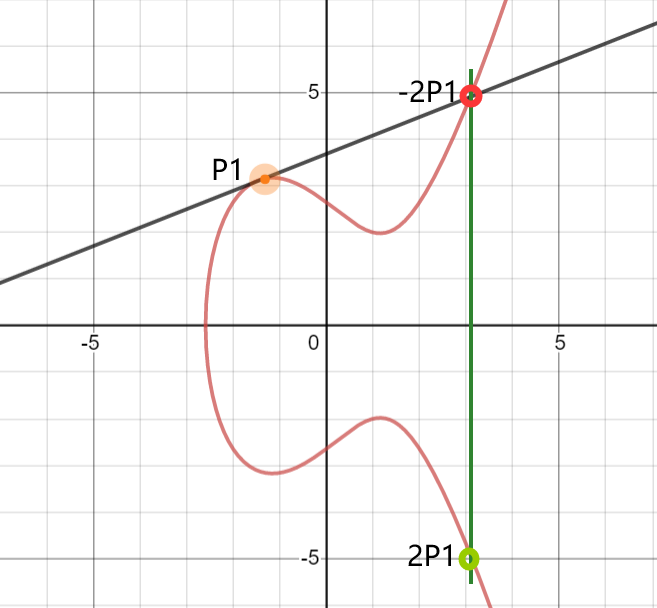 同样道理,经过点2P1做曲线的切线与椭圆曲线相交的点是-4P1,过此点做y轴平行线与曲线的交点就是4P1。可以以此类推。