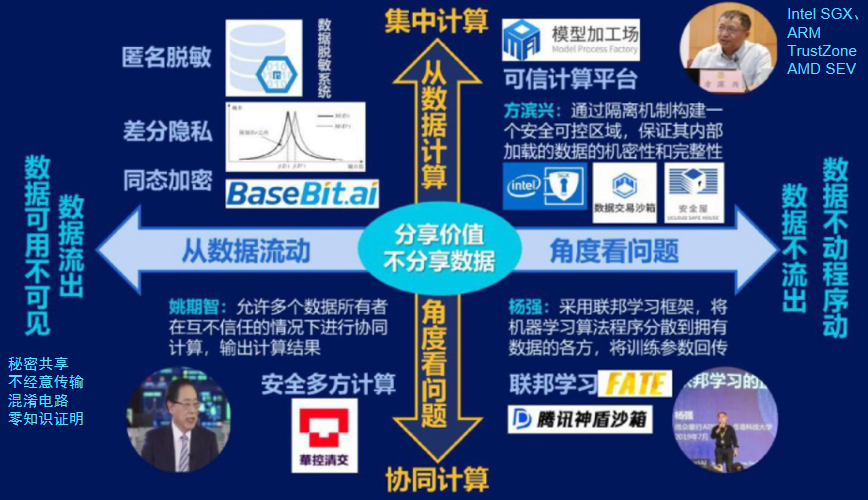 本聪老师:对,姚班是计算机科学,智班是人工智能专业,都是国内顶级本科专业。我们先看多方安全计算,以姚期智院士的混淆电路等为代表,还包括不经意传输,秘密分享,零知识证明等技术,多方安全计算近几年发展非常迅速,原理就是所有参与方共同为一个函数输入数据,然后共同计算函数结果,又能保证这些输入内容不泄漏。主要特点就是数据加密不会泄露隐私,在安全域内流动,经过建模,计算,最后数据的价值流出安全域,将数据变成资产,进行交易。