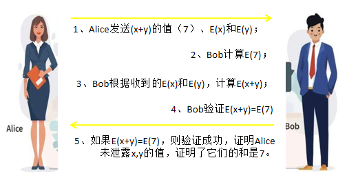- 如果E(x+y)=E(7),则验证成功,证明Alice未泄露x,y的值,证明了它们的和是7。