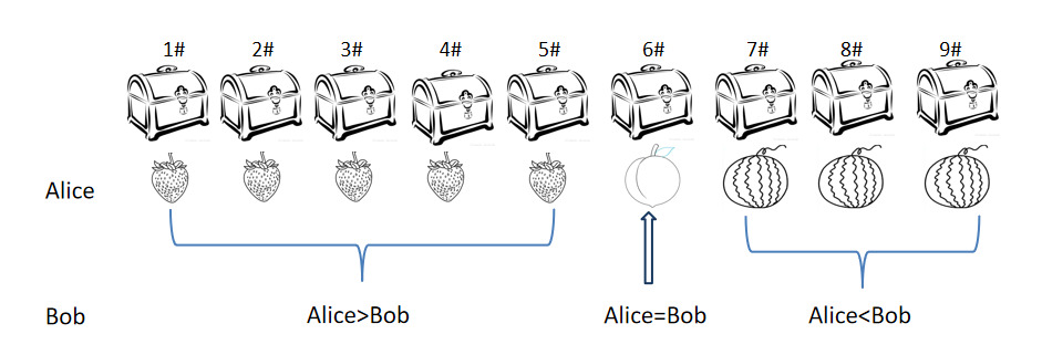 本聪老师:对。如果是草莓,说明Bob的资产少于Alice,如果是桃子,说明两人财富相当,是西瓜,说明Bob财富超过了Alice。