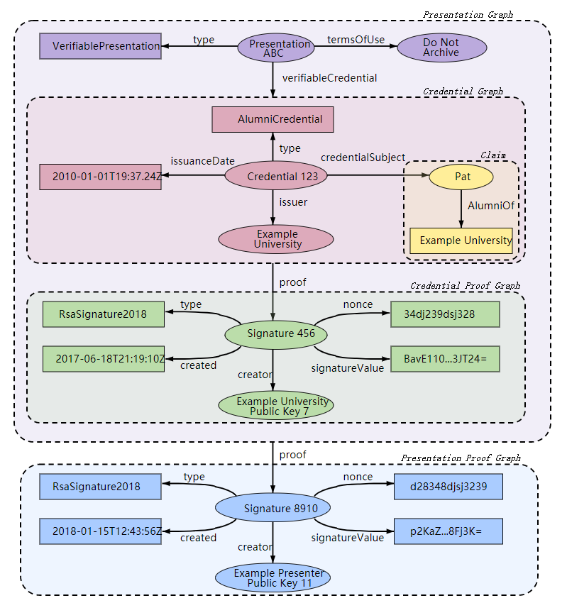 本聪老师:我们再来看表述图像,它又包含三个图像,第一是可验证表述本身图像(紫色),包含表述的元数据。第二个是可验证凭证图像,包含凭证元数据和声明。表述图像中的verifiableCredential 属性会对应一个或多个可验证凭证。第三个信息图像是凭证证明图像,表示凭证图像证明,通常是数字签名。