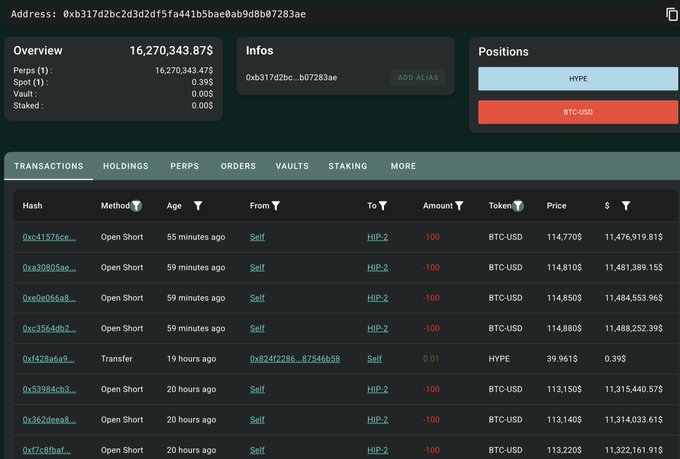 高频做空:14/15笔为“Open Short” on BTC-USD,集中在7小时内爆发式开仓(从微调到-25 BTC规模,总暴露超25 BTC,价值超280万美元)。这与截图一致(50-59分钟前及20小时前多笔),暗示算法或批量执行,针对BTC短期崩盘(3.12事件?)。