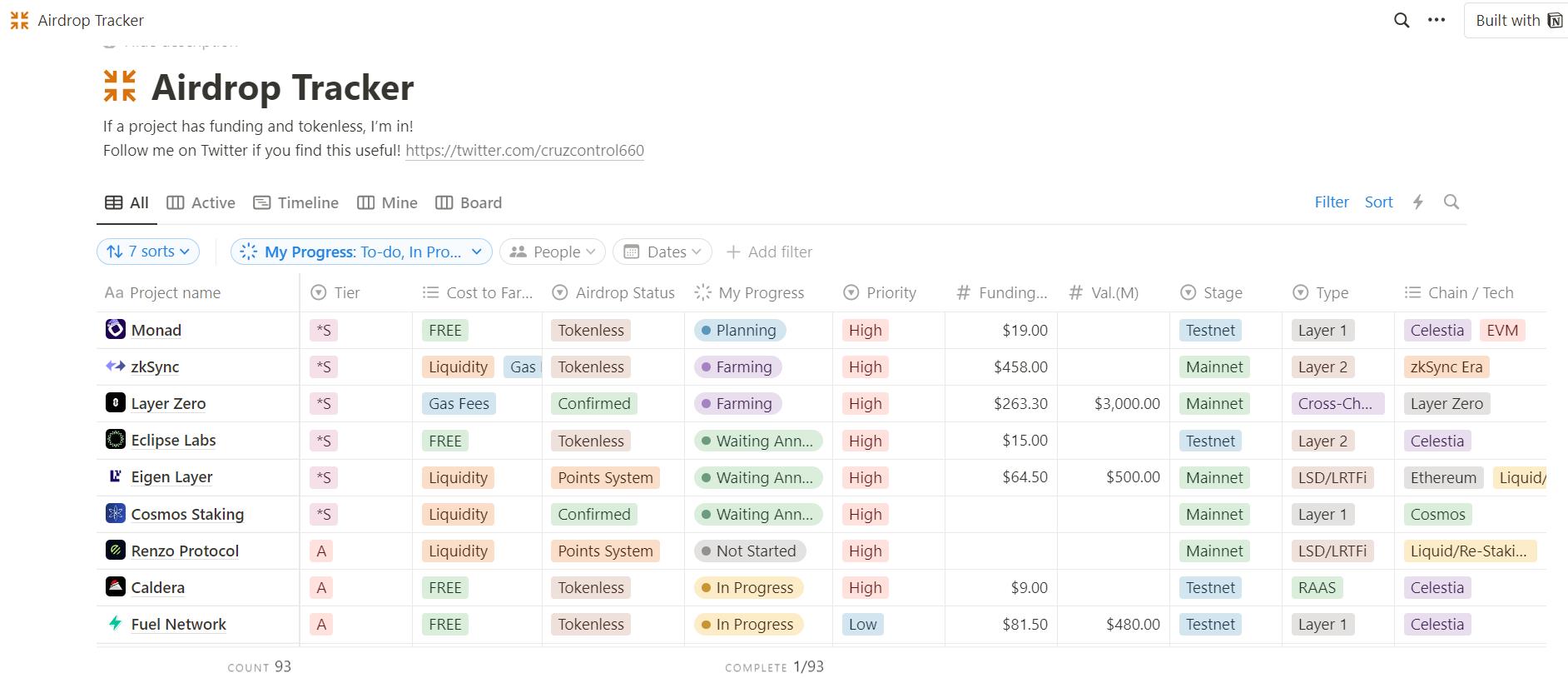 海外空投博主@cruzcontrol660在Notion上创建了一个名为“Airdrop Tracker”的空投项目跟踪器,并将其文档链接公开分享。这个跟踪器包含了多个空投项目的详细信息,用户可以通过不同的筛选条件来查找和跟踪这些项目。