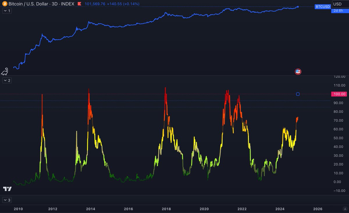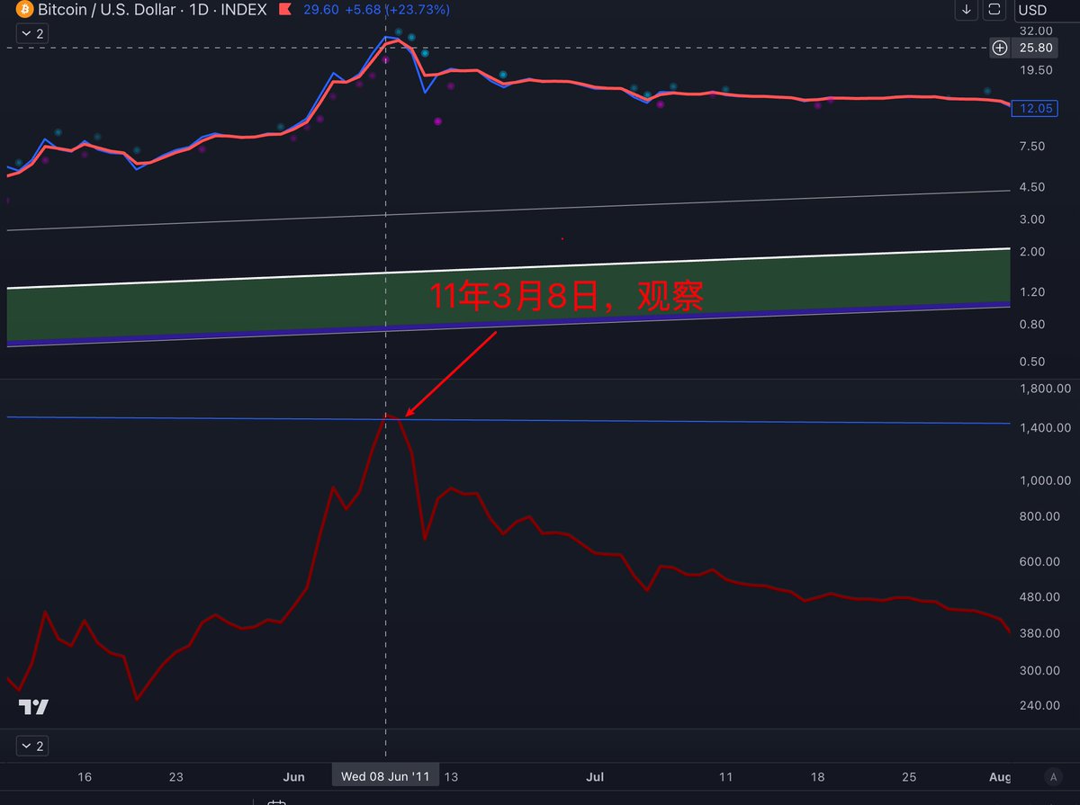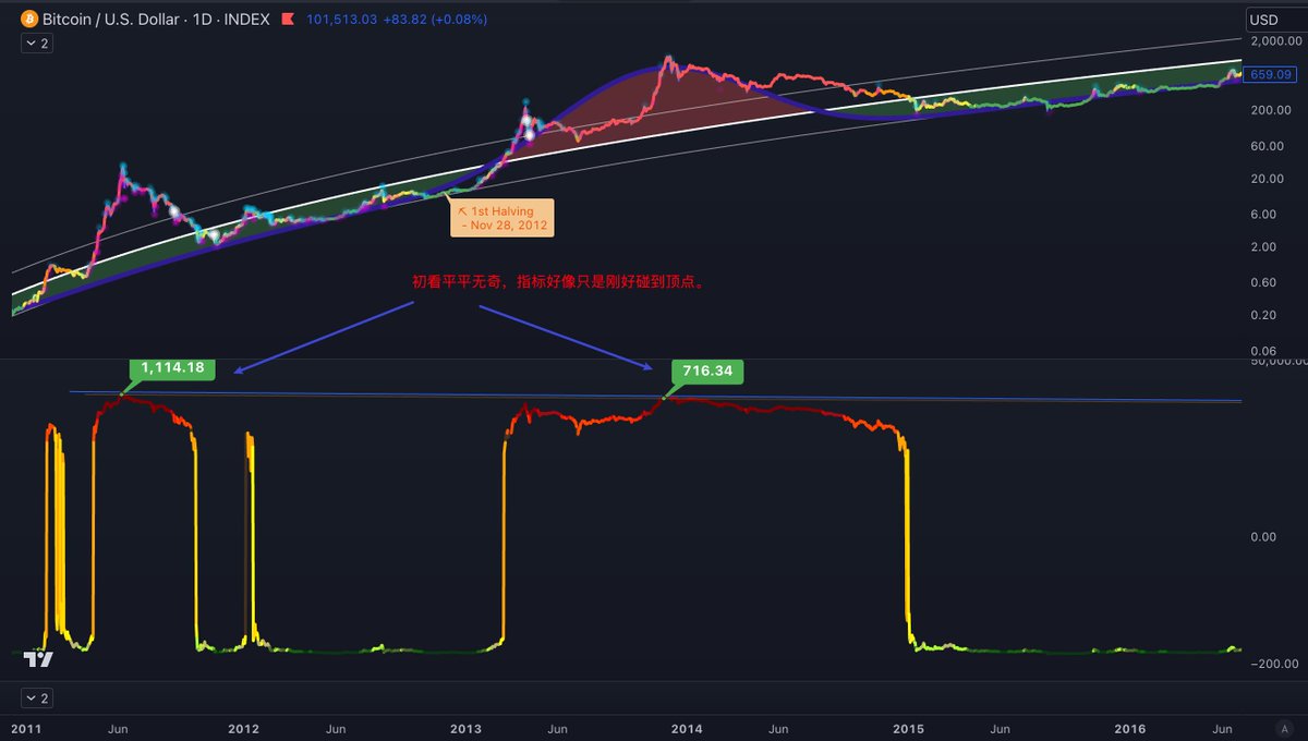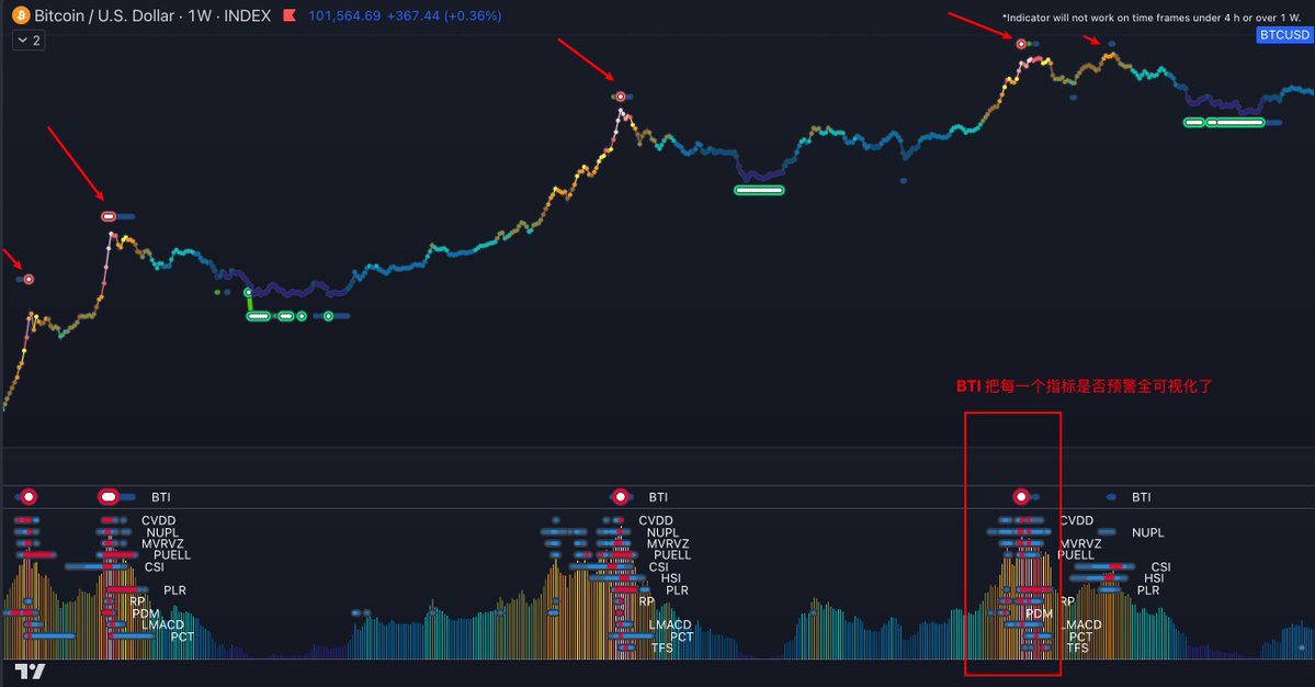 优秀的指标是可以追踪到11年的牛顶的:PLOscDecayAdjusted达到85,90,100/PLOscRelativeToTrend趋势线相交🚨🚨