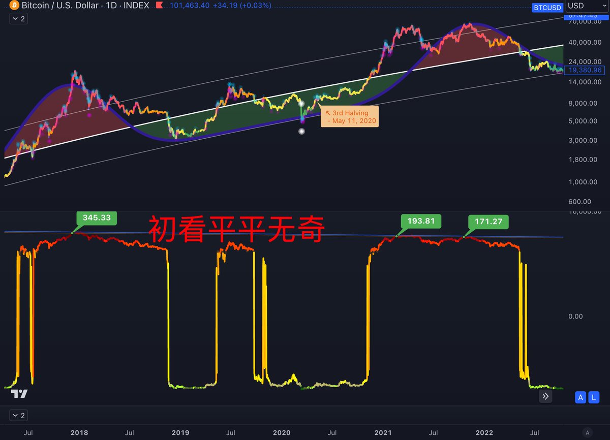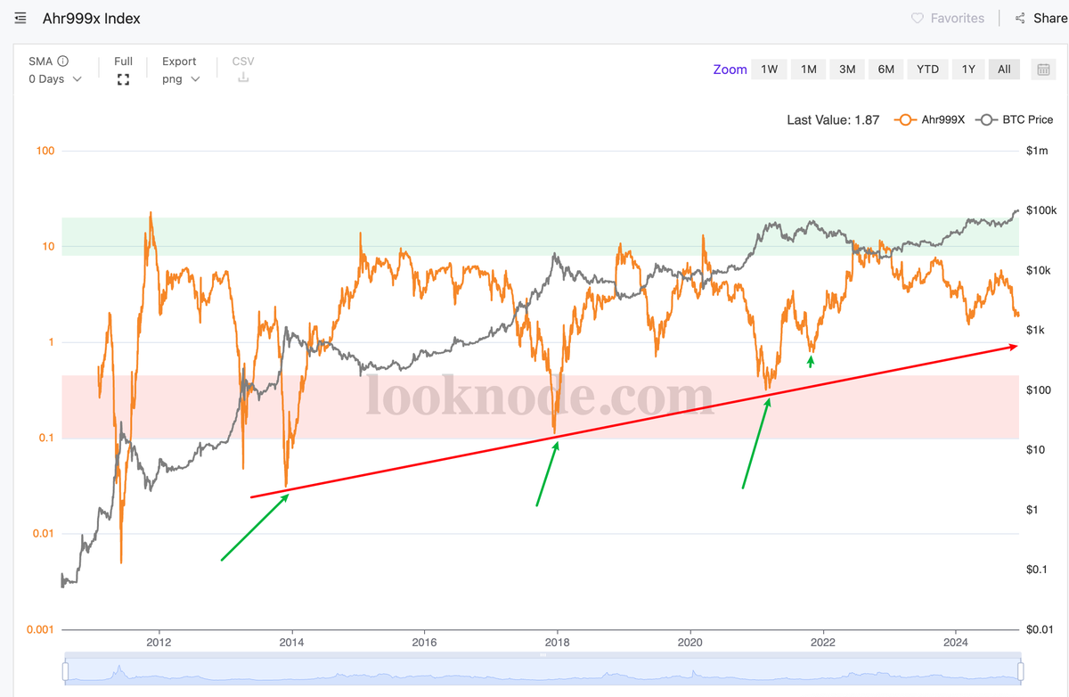 没那么优秀的指标AHR999x,图中显示每一轮牛市 这个指标会下探到底部红色区域,但一轮比一轮高。 那么可选的参考基准是 红色区域,但是如果这一轮的尖峰值没冲到红区呢?