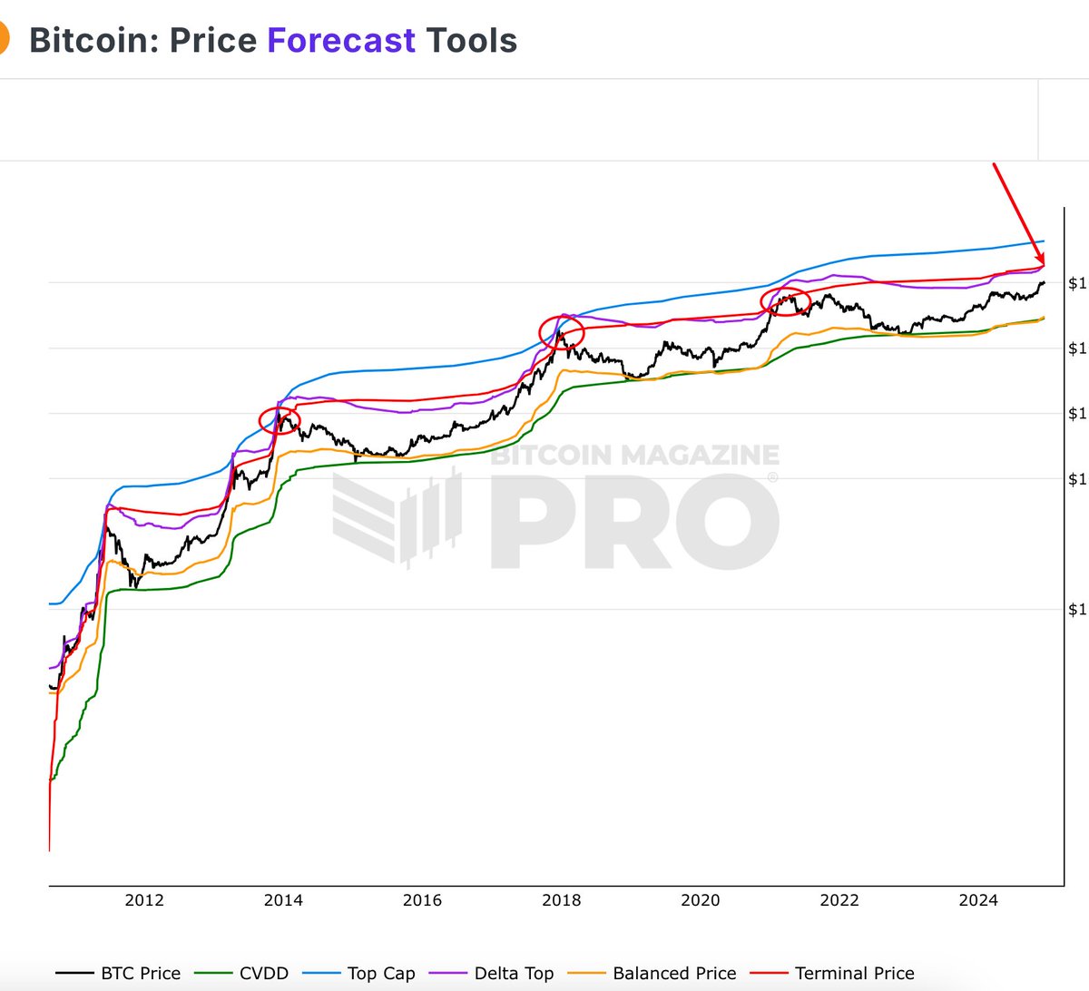 看下图,每一轮牛顶都起码碰到了 terminalPrice和deltaTop的较小值(12月14日当前为182471,即此指标说明BTC价格应该达到18万)