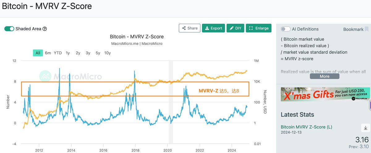 指标不太优秀,有尖峰递减的隐患, 所以我的摸顶清单中列的是: MVRV-Z 达5 达8