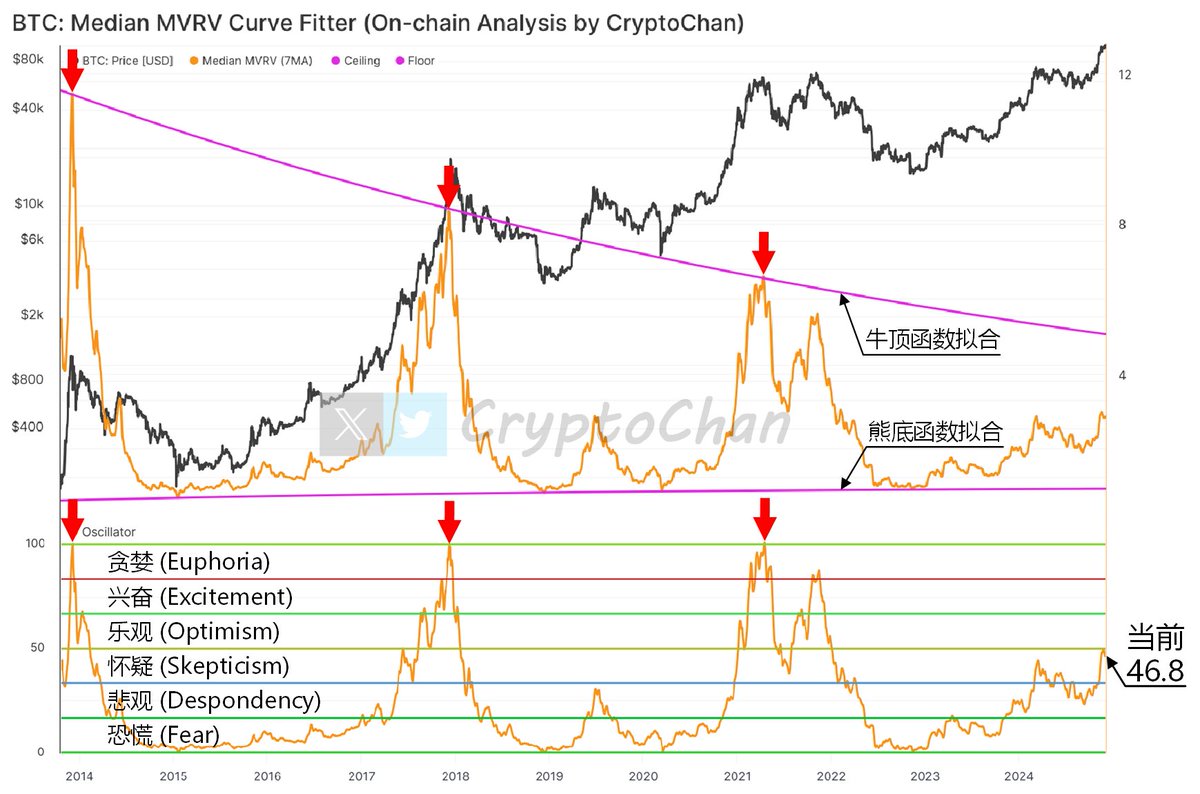 对 Median MVRV 进行牛顶熊底函数拟合,基于拟合函数采用新开发的振荡指标从 0 – 100 将 Median MVRV 完整囊括划分为6个区间