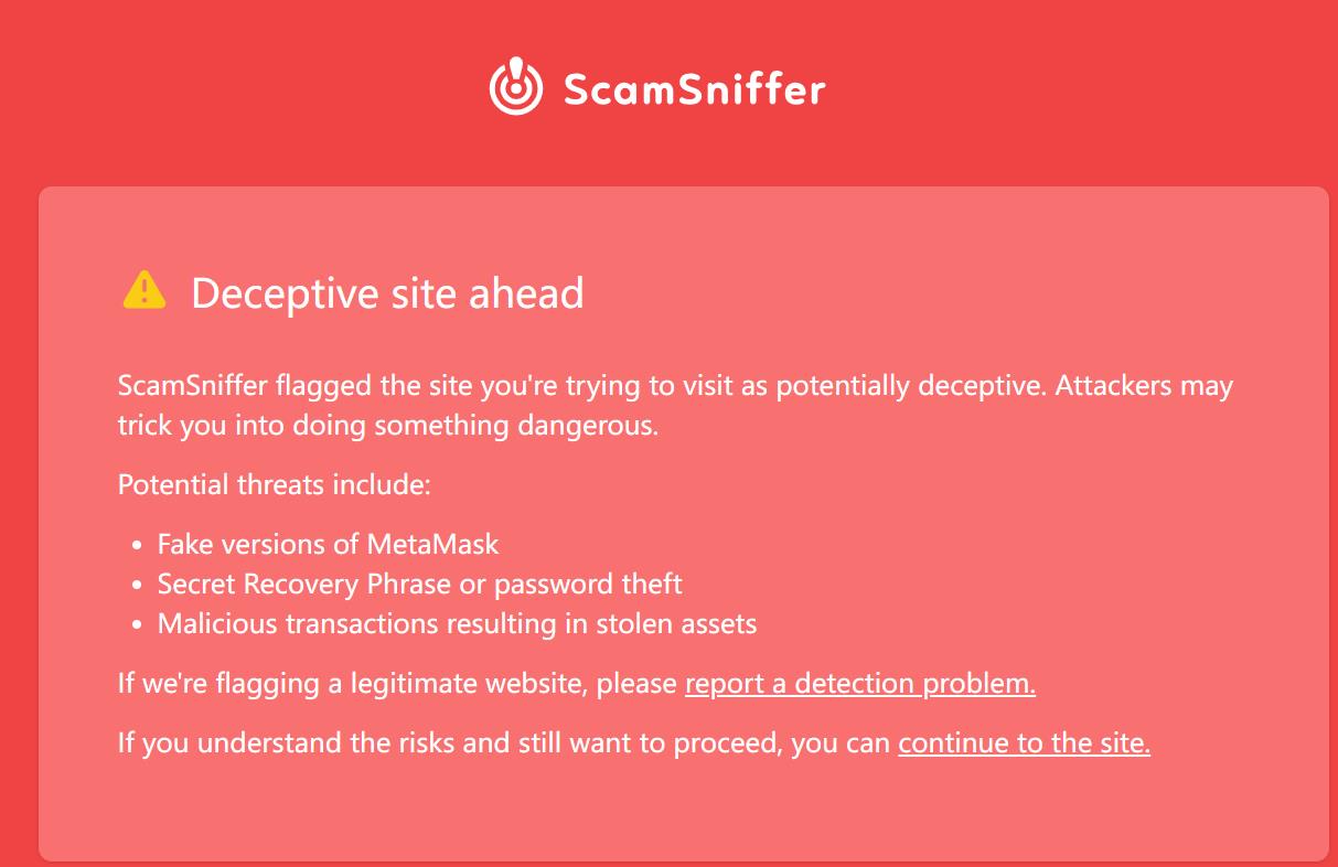 点击图片后直接跳转到ipfs网址(骗子网址就不留了)。这是scamsniffer对链接的反应: