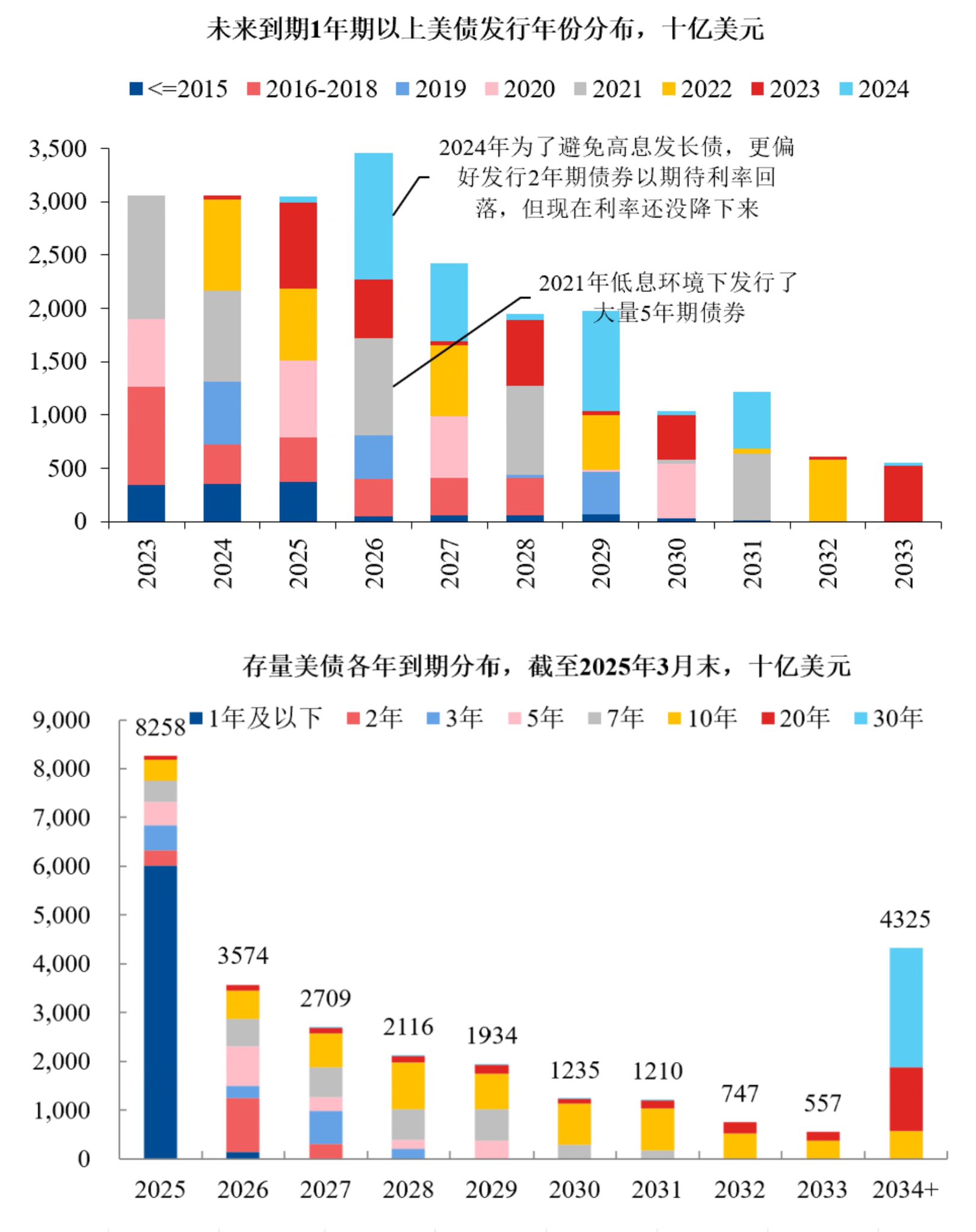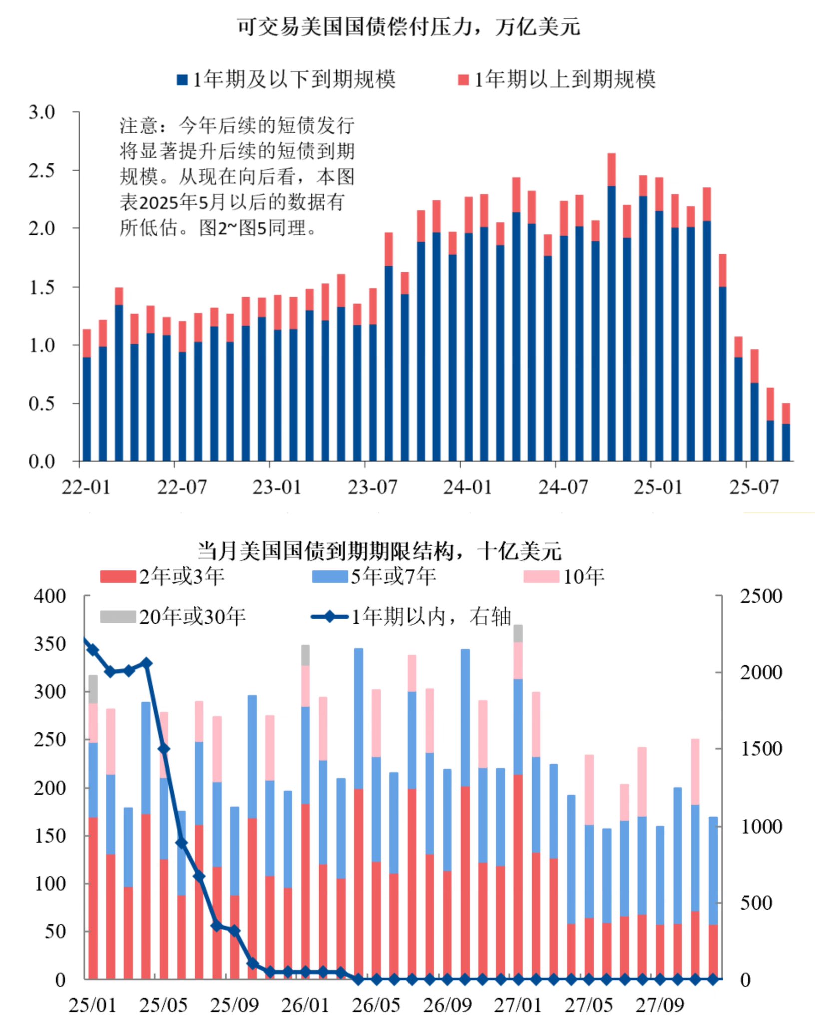 2、从图1看出来今年到期美债占比最大的也都是短债,主因是2023年10月后美国财政部调整国债发行结构,增加了短期国债的发行比例,使得此后短期国债每月滚动到期额均出现提升,导致2023年10月后短期国债的到期额显著高于历史同期。