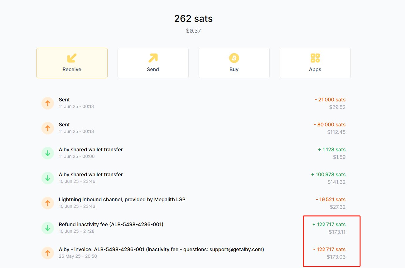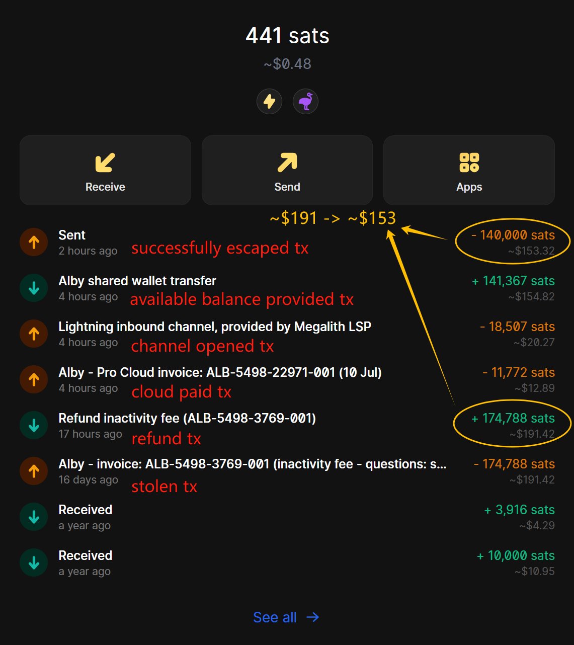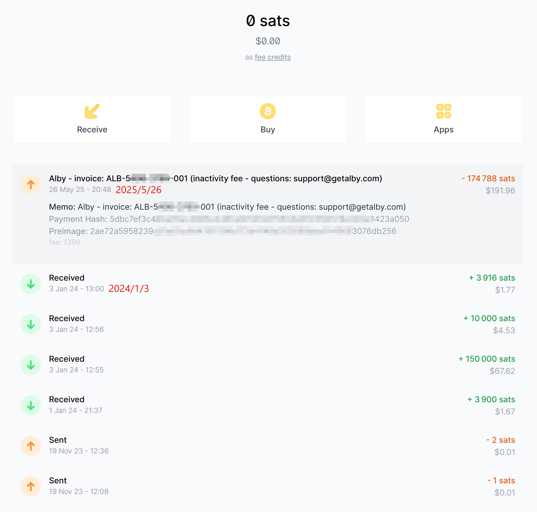 其他有此遭遇的朋友,如果你们没被退回资金,可以发邮件给官方询问(你被转走的那笔消息里有官方邮箱),你可以采用官方回复的要求步骤(比如要花钱注册他们的 Cloud 或者搭建 Alby Hub 等),当然也许也可以像我这样什么都不做,直接拿回。