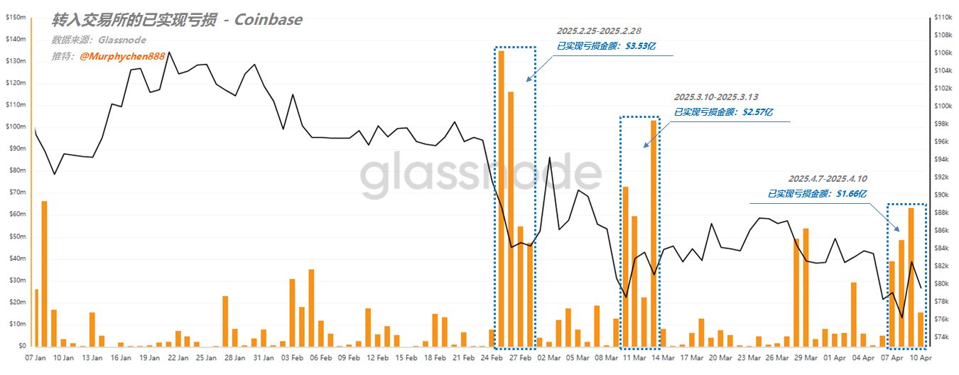 “转入交易所的已实现亏损金额”是衡量市场投降程度的重要量化指标之一。我主要以Binance、OKX与Coinbase三家头部交易所的数据作为参考依据。因其流动性更好,能承接大额资金的进出,从而更真实地反映市场情绪变化。