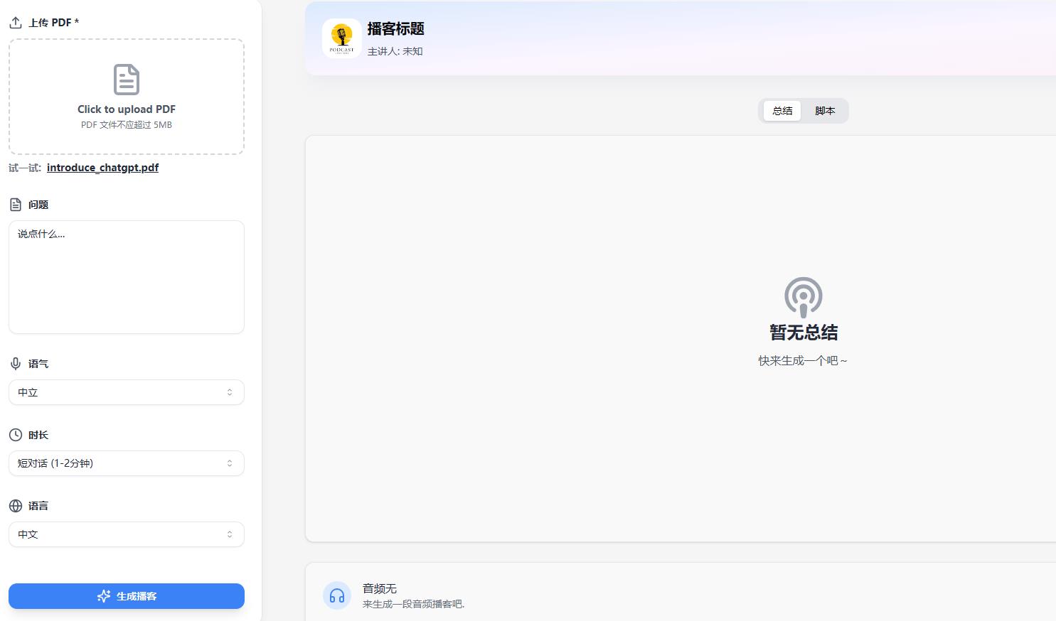 PodCastLM提供了更完整的工作流,从PDF处理到最终的播客生成。