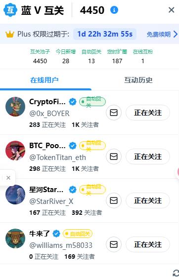 就是插件里所有蓝V用户的集合,池子越大,你能互关的人越多,涨粉越快。 - Plus权限过期怎么办?