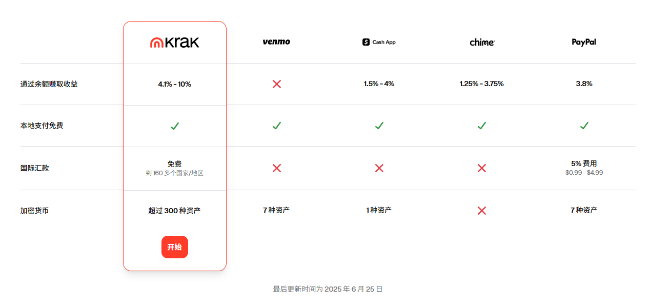 余额收益(对比Chime/PayPal): Krak的4.1% – 10%收益率显著高于Chime的1.25% – 3.75%和PayPal的3.8%。