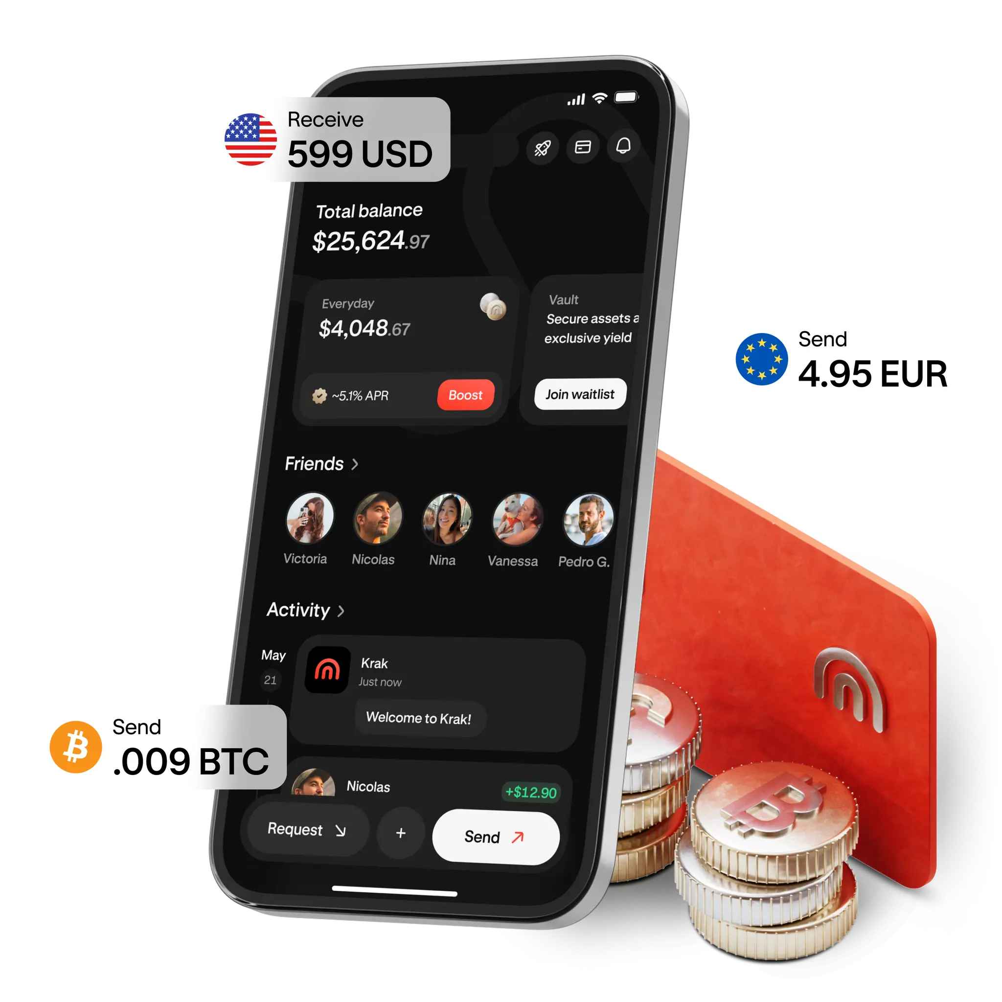 Krak是Kraken推出的一款全球支付应用,让你能像发短信一样简单地进行P2P加密货币和法币转账,支持160多个市场和300多种资产,还能自动赚取收益,没有隐藏费用和锁定期限。