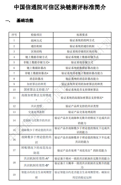 【主要内容】:本标准包含了评估可信区块链功能的方法和指南。主要内容包括:基础功能、BaaS平台、性能标准、安全标准、存证应用标准、供应链金融、密码专项、溯源应用标准、政务应用标准等。