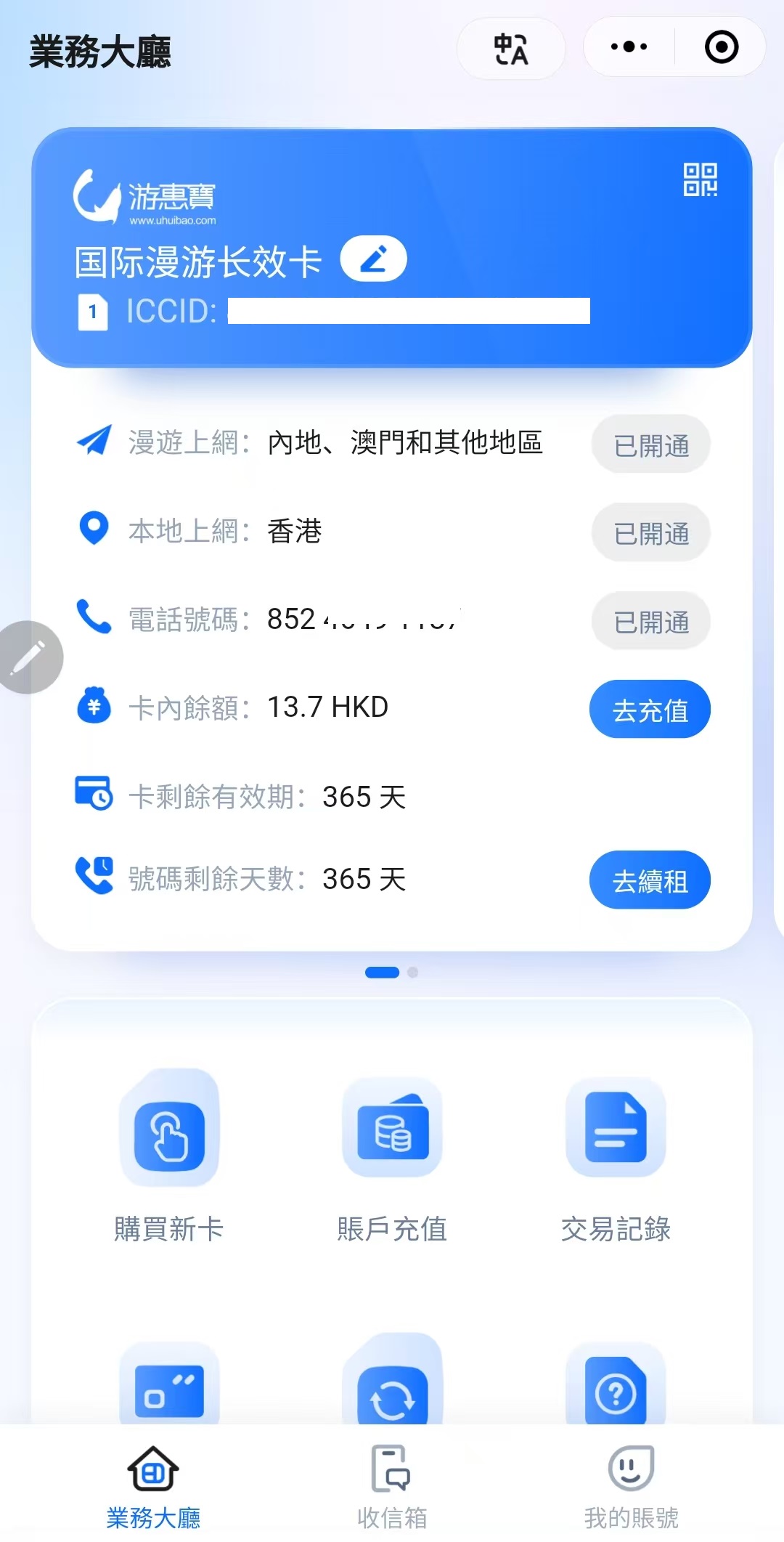 可在小程序内查看余额、续费(续费最低36HKD/年)。支持查看使用记录、流量统计。