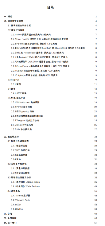 - 区块链安全状况概述:报告首先介绍了2023年区块链行业各赛道的安全状况,包括交易所、DeFi、NFT等领域的重大安全事件。