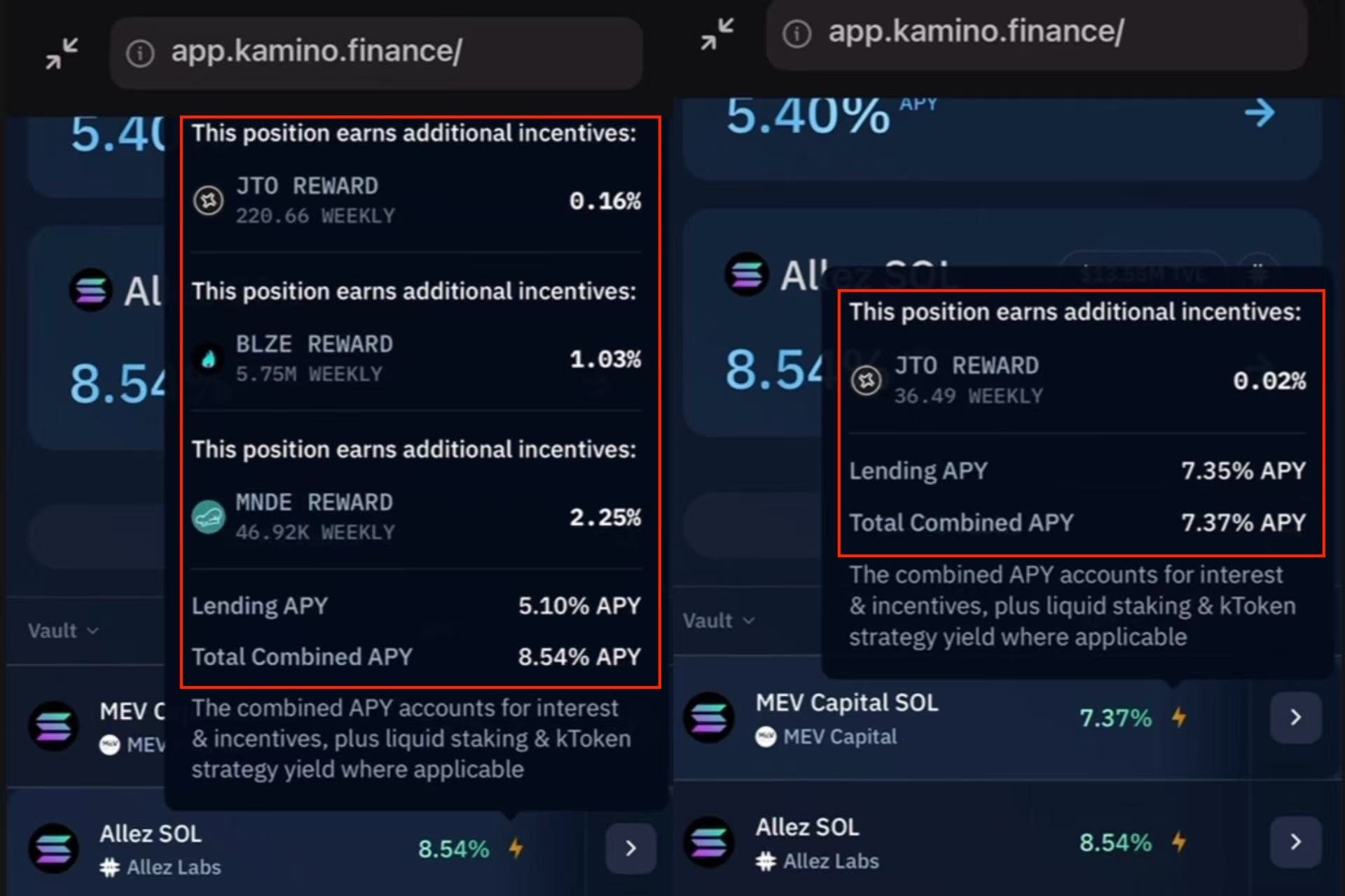 举个例子,下图是Kamino两个$SOL的借贷池:「MEV Capital SOL」和「Allez SOL」。「Allez SOL」的APY是8.54%,是要高于「MEV Capital SOL」的7.37%。