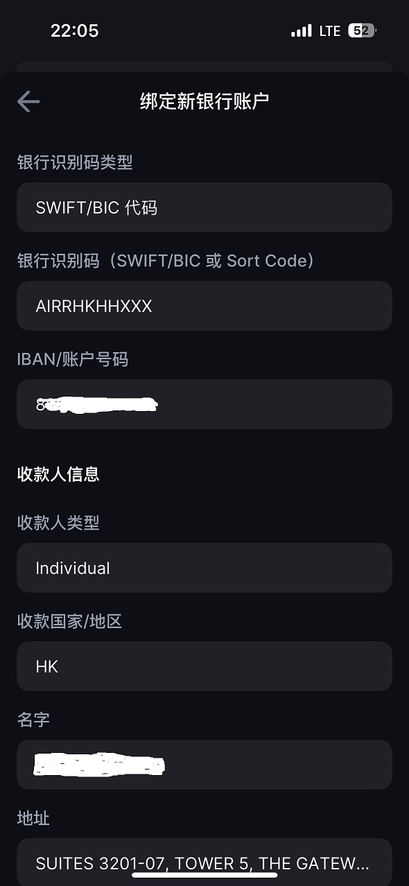 IBAN/账户号码:香港银行大都没有IBAN号码,这里填写账户号码就可以。