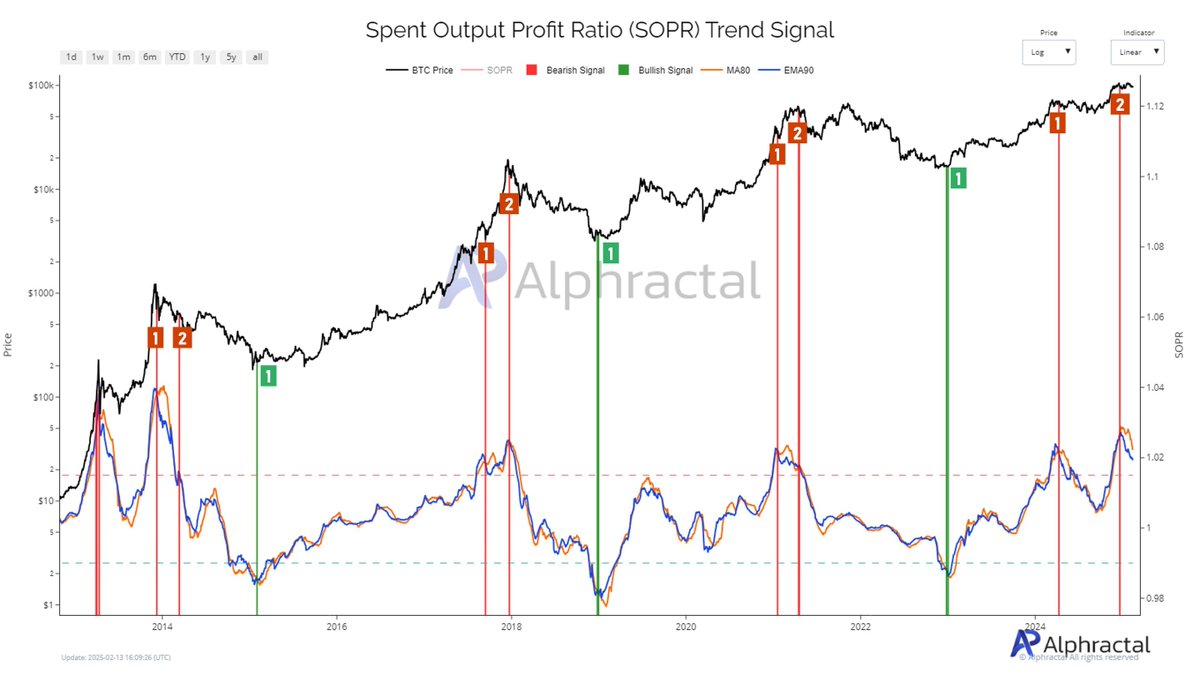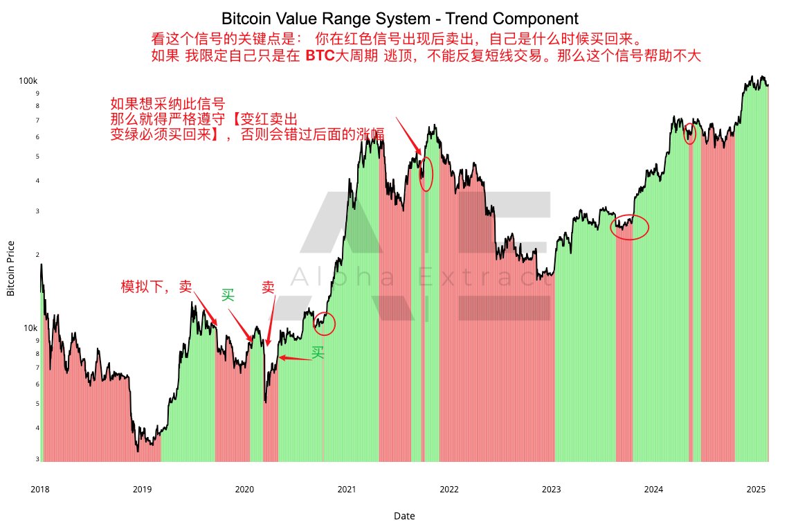 43A6@_43A6 Feb 16 View on Twitter 【又一风险预警信号】 Bitcoin Value Range System 由绿变红,看过往历史,变红大概率出现在熊市。这个信号有要注意几点: 1. 没有 2018年前的数据 2. 黑盒算法 3. 只适合短线,严格执信卖出和买入。即对逃顶帮助不到。 https://x.com/alphaextract_/status/1890563536574726604 Show this thread