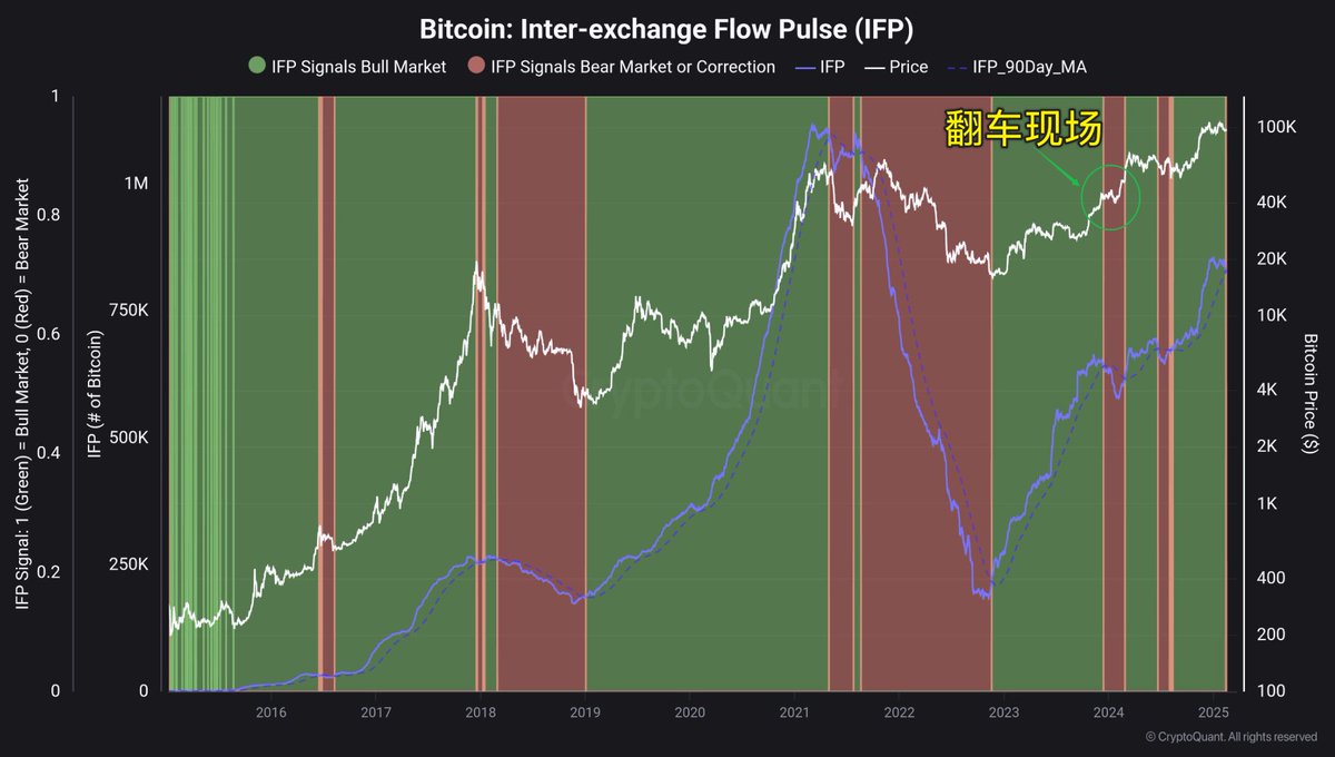 43A6@_43A6 Feb 16 View on Twitter 【和BVRS Trend 类似结论的预警信号】 Inter-exchange Flow Pulse (IFP) 当交易所资金从现货流向衍生品时,是调整/熊市信号。 现在空头开始攒动,这个表比BVRS Trend好的是有2015年数据,但是即使严格执行转红卖出、转绿买入,也有翻车的时候。 我就看看,知己知彼。Show this thread