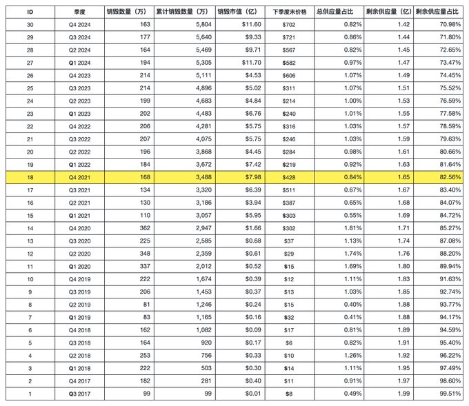 “问题又来了,销毁会导致供应量减少,供应量减少利好币价,但这三者是否存在可量化的关系呢?我经过大量调研,很抱歉,水平有限,无法给出可量化的结论,这里先留个坑。”