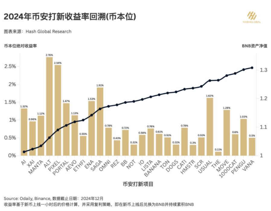 “如果从2024年年初采用币本位复投策略(即新币上线后卖出换成BNB,并持续滚动投资),叠加BNB自身的价格增长,年末总体收益率约为284%。” via@lindazhengzheng