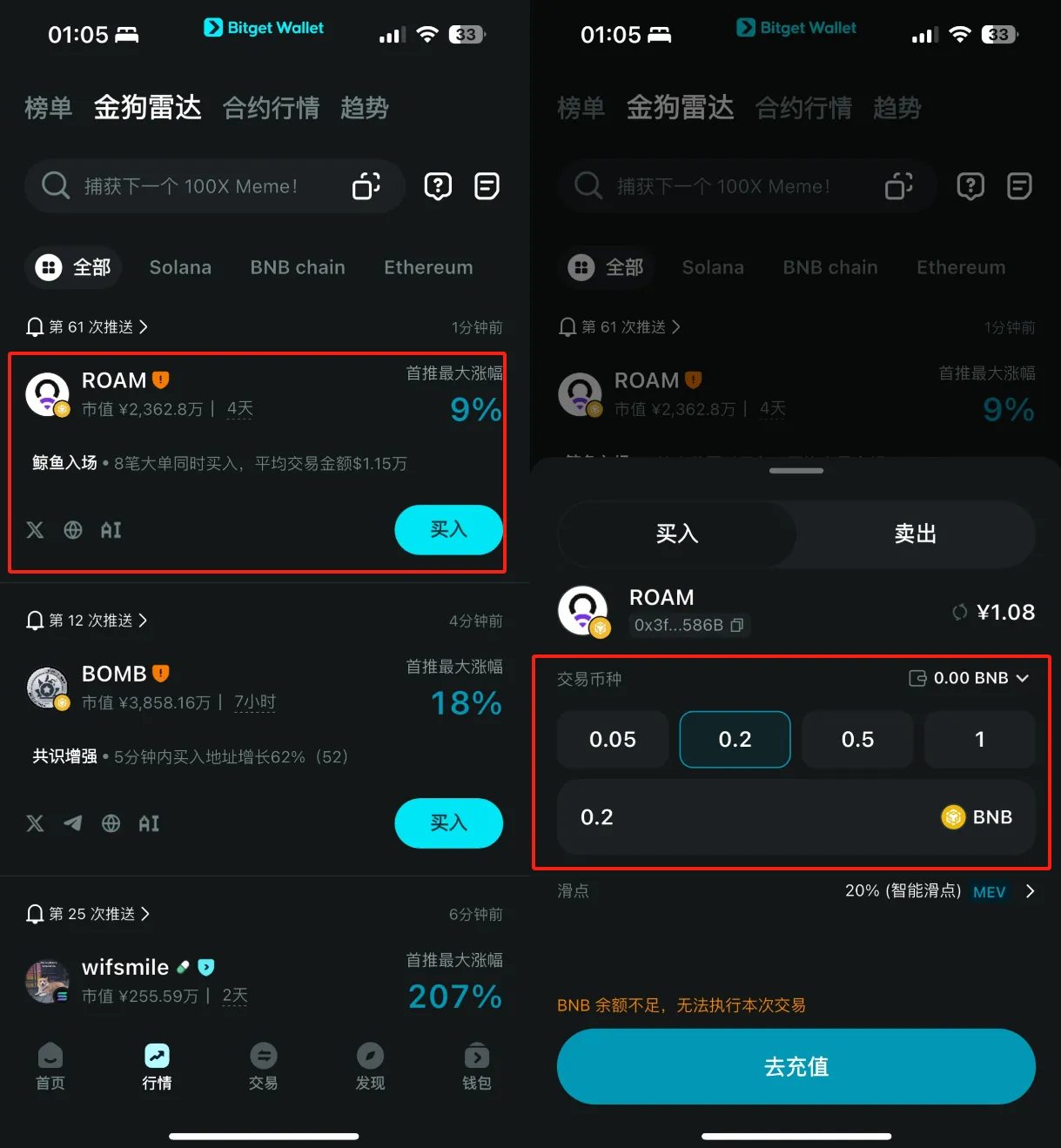 进入金狗雷达:打开 Bitget Wallet 应用,前往“市场”或“发现”页面,找到“金狗雷达”功能。