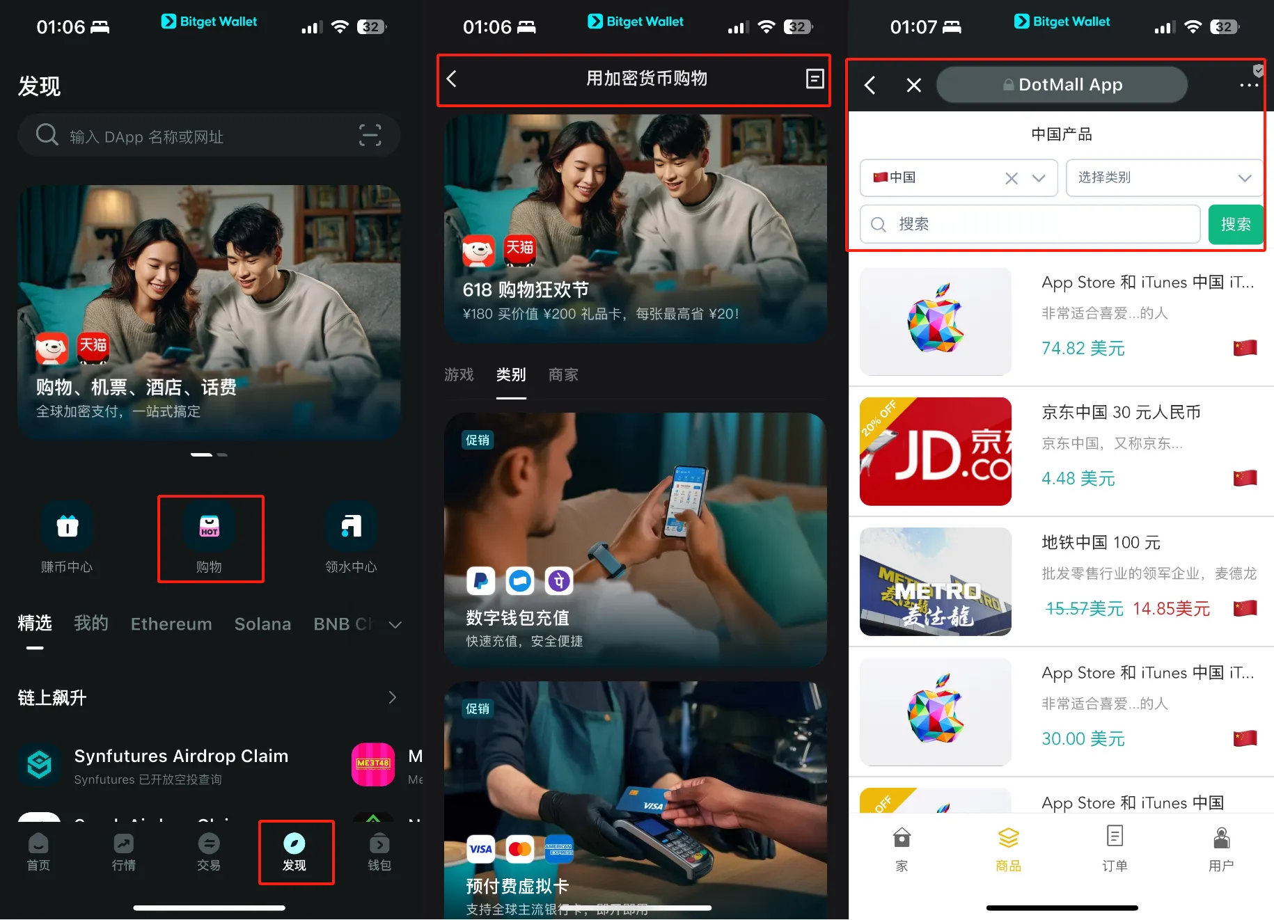 点击【发现】➝【购物】,你可以用 USDT / USDC 购买京东卡、话费充值、eSIM、Netflix订阅、机票酒店、Visa虚拟卡等服务。所有商品都支持链上支付,支付成功后你会收到邮件兑换码或凭证。覆盖全球超100+服务类型,真正让你的链上资产用起来。