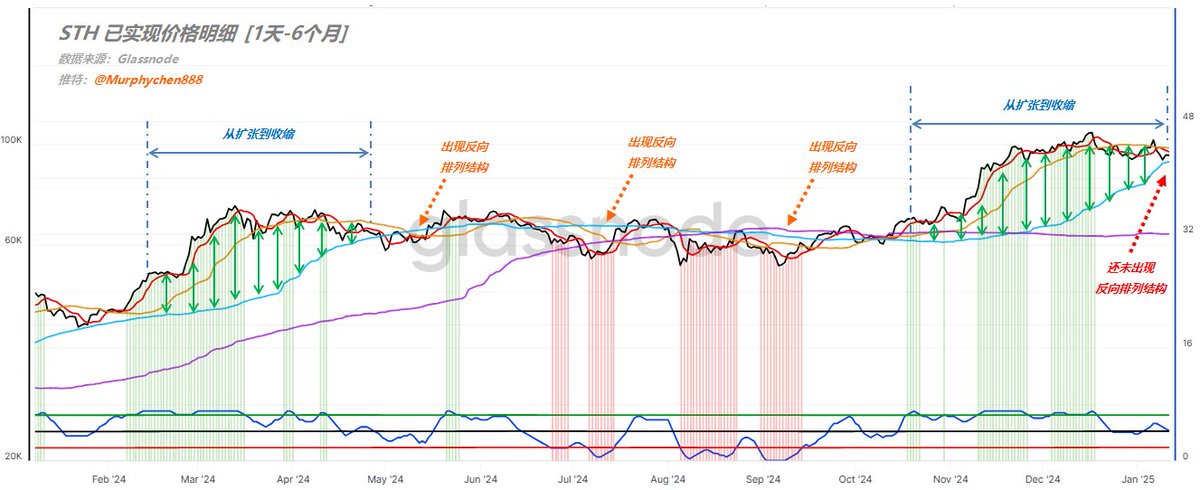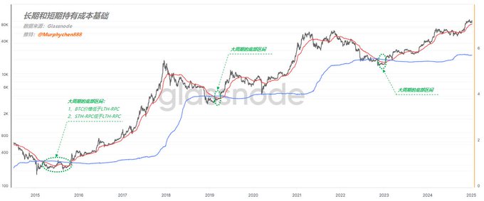 说明在价格下跌的过程中,短期内有大量的STH亏损离场,但又有新的STH进来抄底;经过频繁换手后,反而把短期的筹码成本拉到长期筹码的成本之下。这是阶段性价格超卖,恐慌情绪见底的信号。