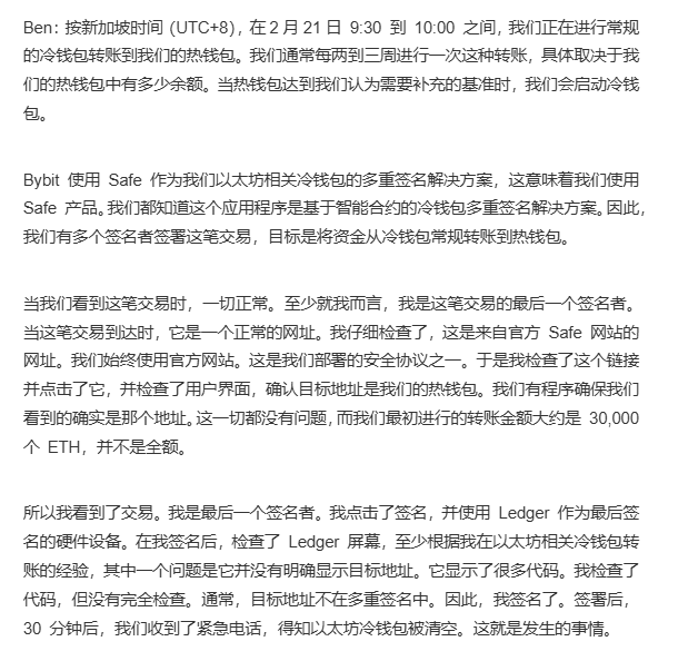– 检查过,所有参与签名的人的电脑上都没有木马。各种可能性都有,但现在没办法确定排除哪一种,所以还在查。可以把冷钱包想象成汇丰银行。这次事件就是“汇丰银行”这边出了问题 — — 我把钱往回拿的时候被拦截,导致全部被盗