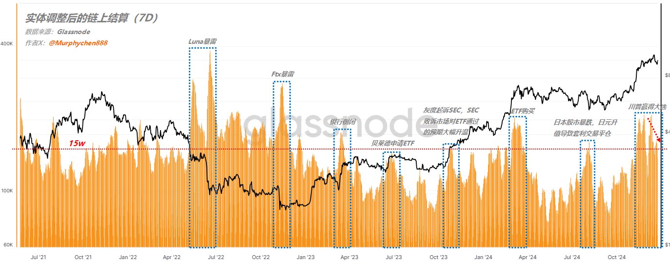 每一次推动市场情绪变化的事件发生,都伴随链上换手量的突然暴涨。经过数据筛选,把同一实体地址集群的转账剔除后,通常每日链上真实换手量大致在10w枚BTC左右(7日平均),工作日多一些,周末少一些;如果超过15w枚,就是一个“非正常”的数据。