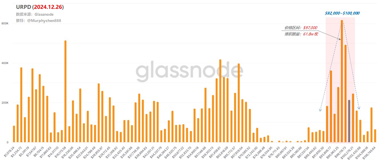 从当前的数据看,链上结构正在$92,000~$100,000 范围内逐步形成筹码堆积区,其中$97,000处产生了一个高达60w枚BTC巨量柱,并以此为中心峰值向两边递减。