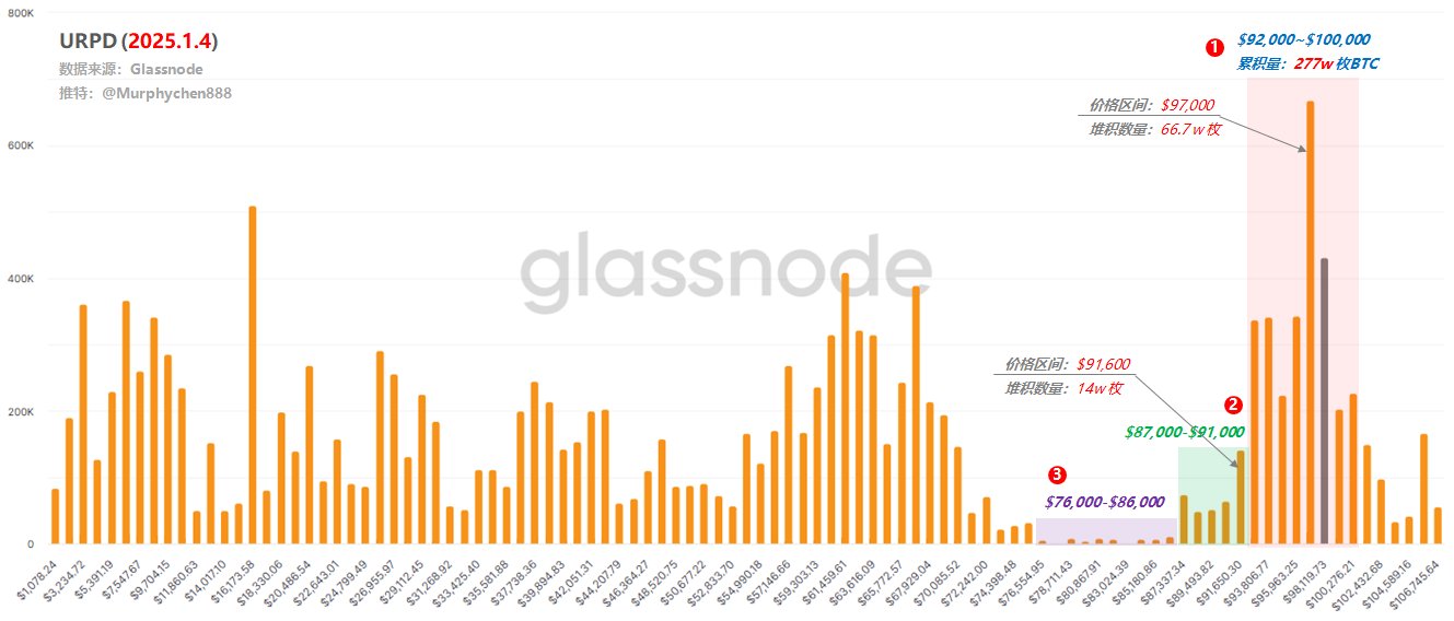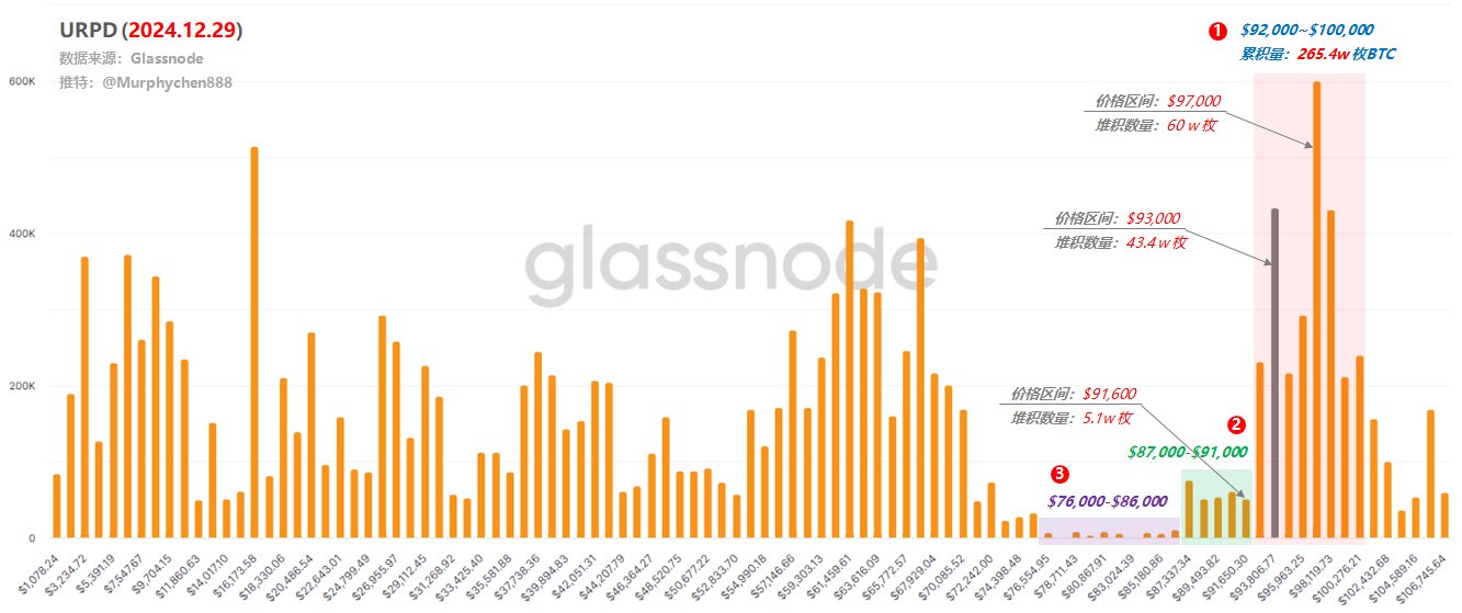 在12月29日的推文中,我根据链上筹码结构(URPD)给本轮回调可能出现的价格区间做了3个标注,分别对应着:1、$92,000~$100,000;2、$87,000-$91,000;3、$76,000-$86,000;而1是目前最强的支撑区间,在过去的一周里,BTC价格始终在这个区间范围内盘整。
