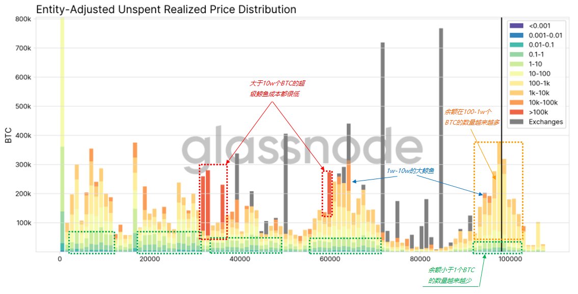 在9w-10w价格区间也有少量1w-10w枚BTC的大鲸鱼,但数量不是很多。而超级大鲸鱼(10w+)则成本更低,他们更多的是出现在3w-4w以及6w美元附近,平均拥有100-300%的未实现利润,也是最有可能产生利润兑现的LTH群体之一。